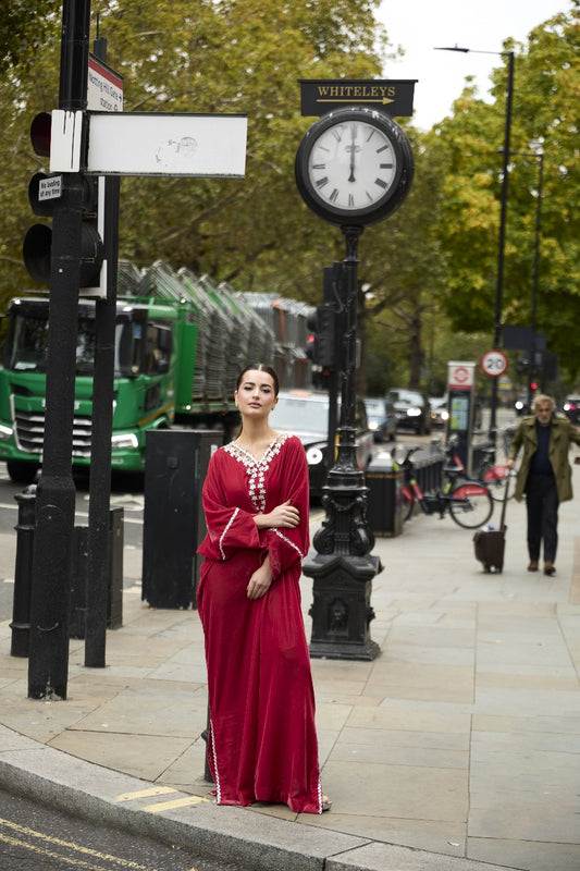 Rosa features an elegant kaftan adorned with our signature statement neckline, beautifully enhanced with intricate...