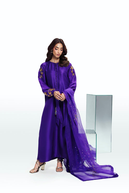Color: Teal Blue/Cobalt Blue Features:Shirt- Premium Sheesha SilkFarshi Shalwar- Premium Sheesha SilkDupatta- Premium Organza Product...