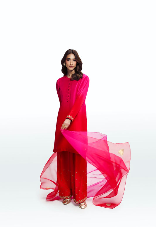 Color: Hot Pink Features:Shirt- Premium Sheesha SilkSharara- Premium Sheesha SilkDupatta- Premium Chiffon with Mukaish Product...