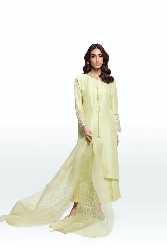 Sonia, is a soft pastel lime ensemble designed for understated elegance. The straight-cut shirt illustrates...