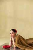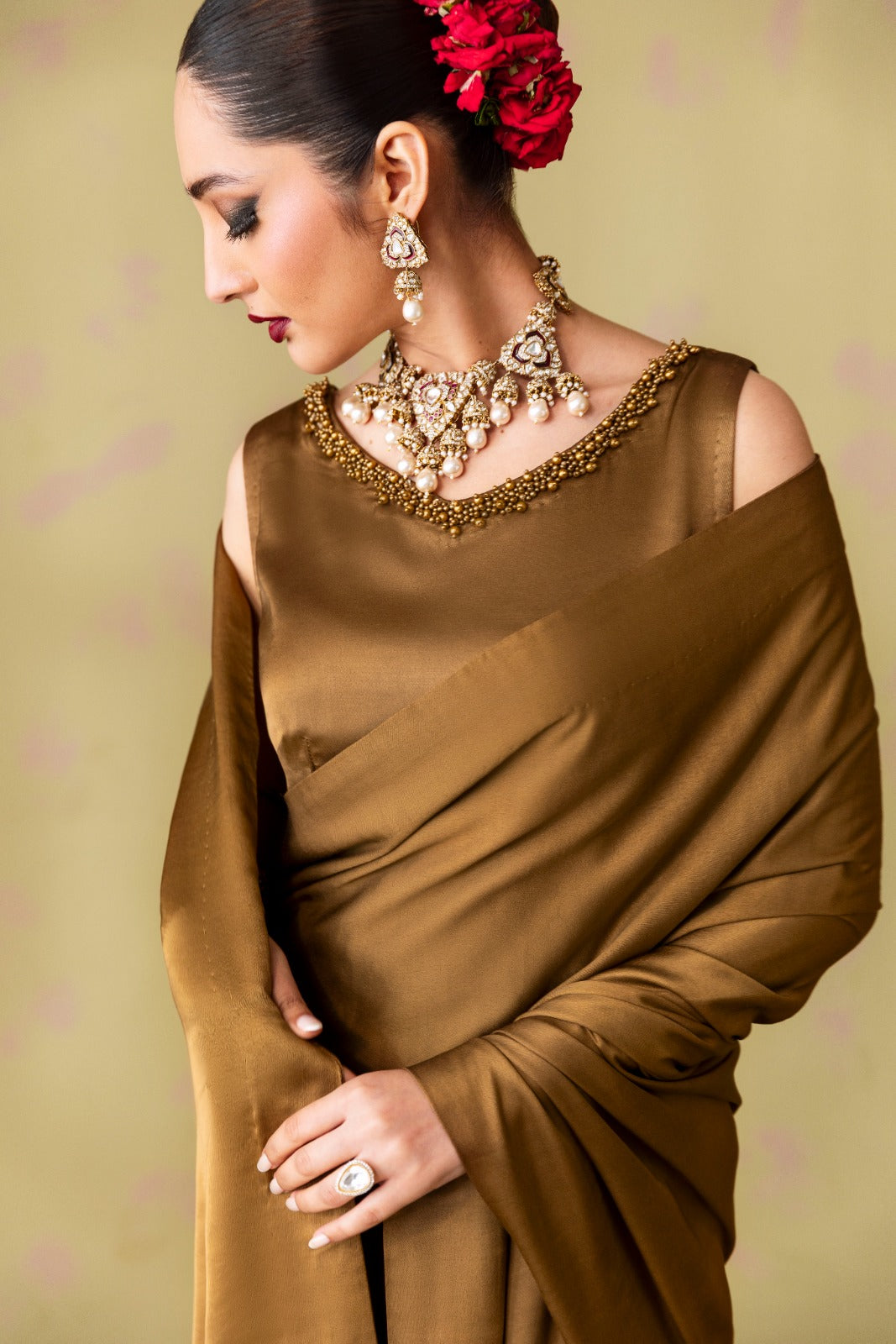 Chandni-This elegant saree features a beautifully designed blouse with delicate pearl work along the neckline. The graceful drape of the saree enhances the timeless charm of the embellished blouse, creating an ethereal look.