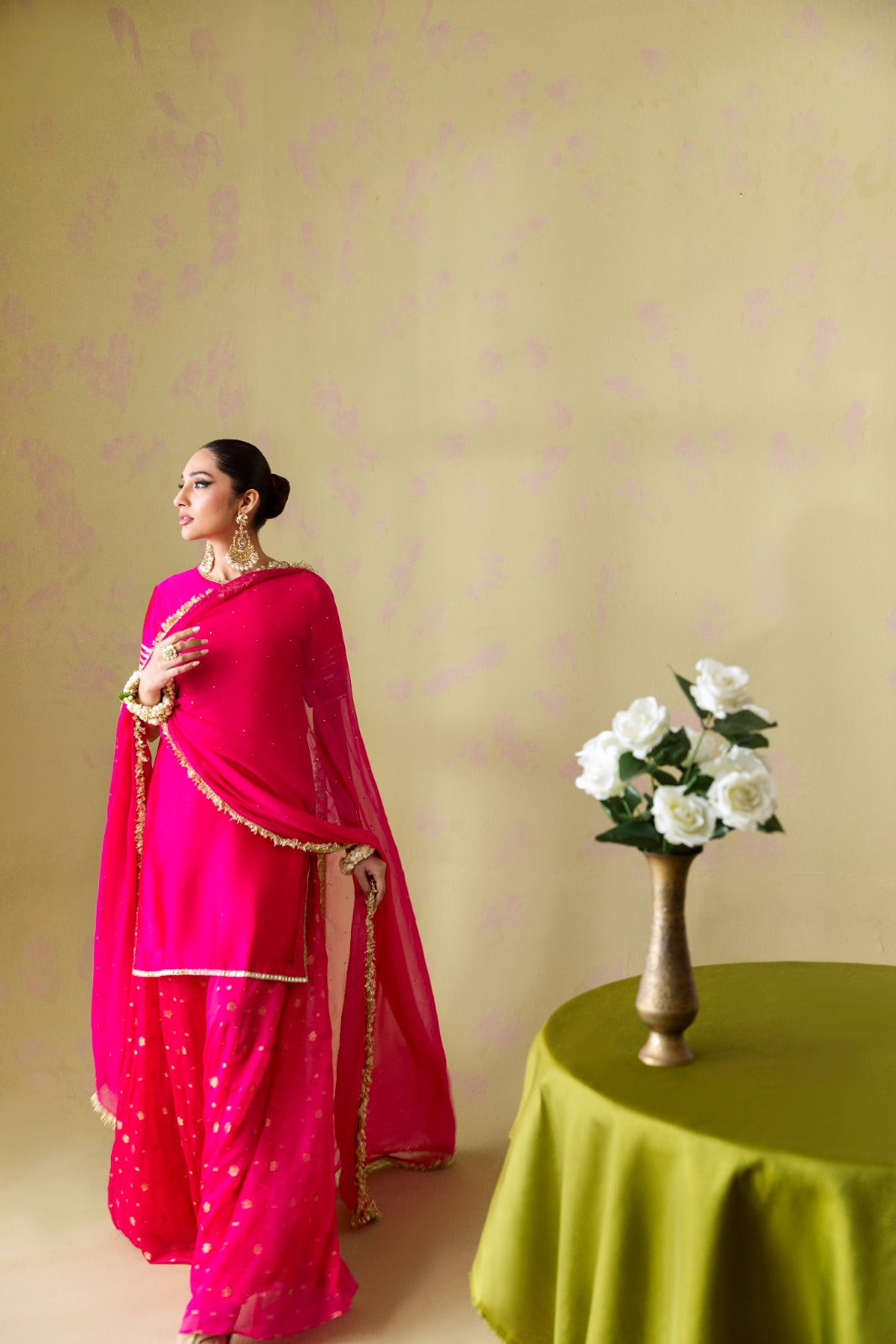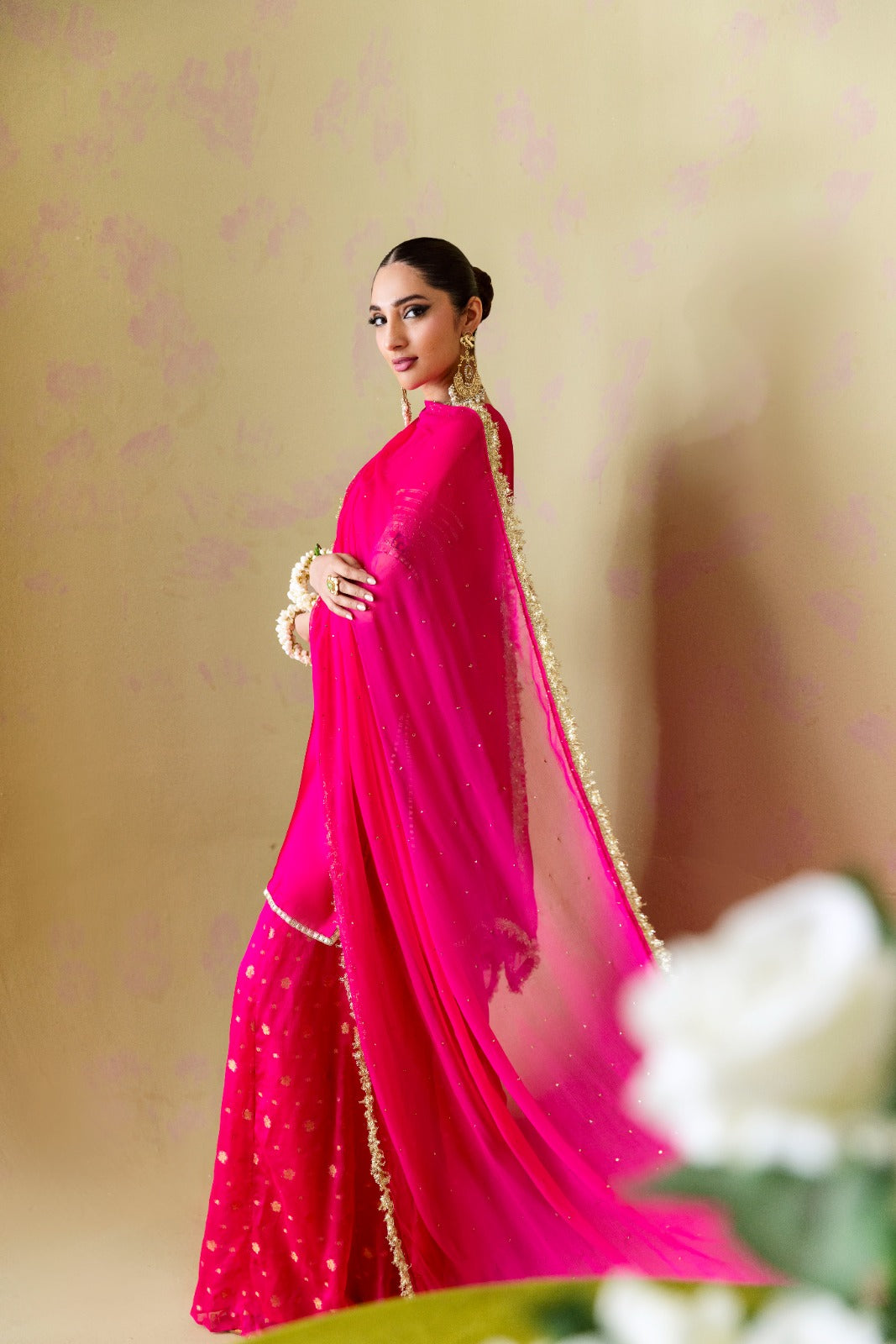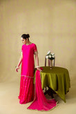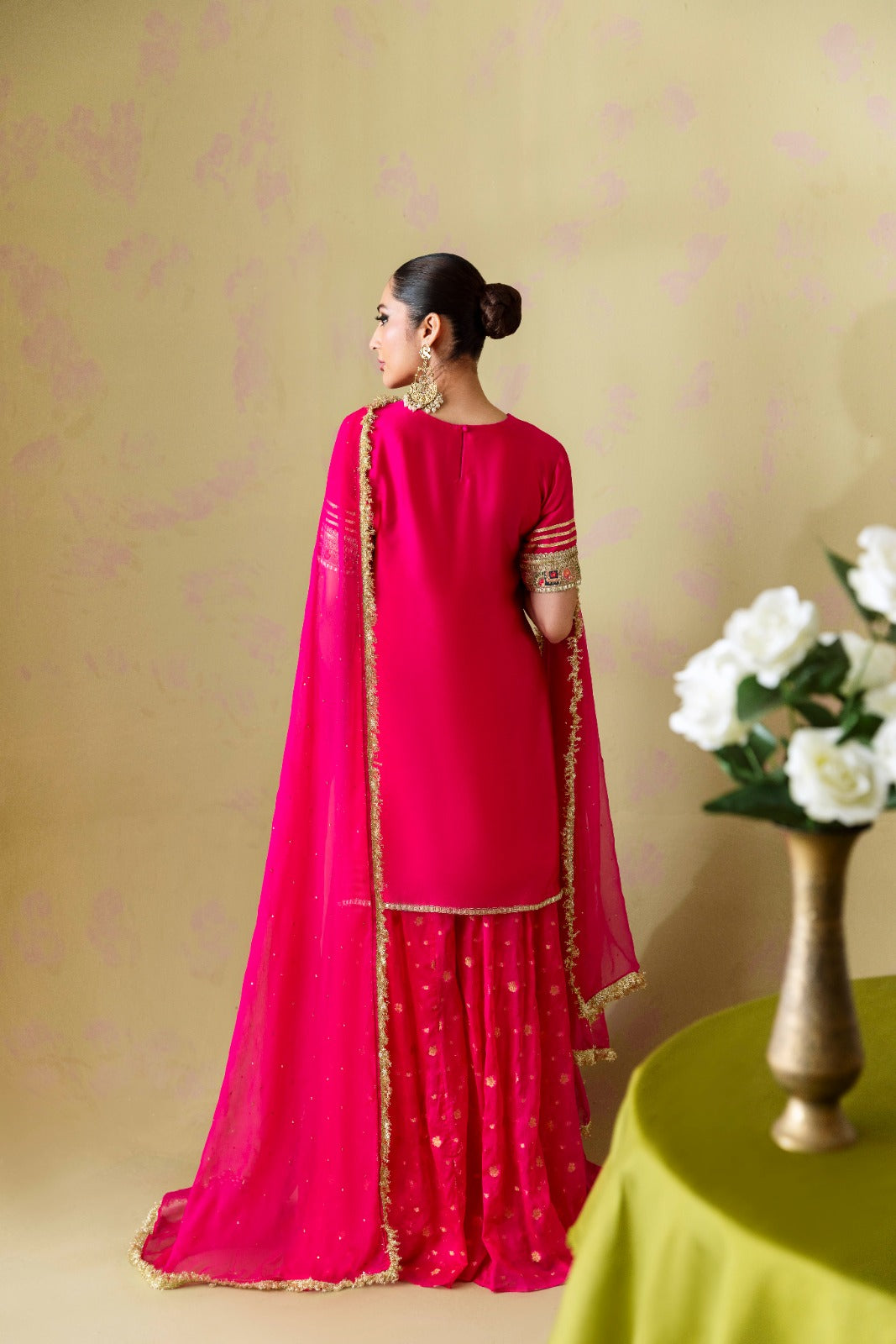 The shirt features elegant golden lace on the sleeves and neckline, complemented by vibrant multi-color lace with delicate sequins. The dupatta is adorned with shiny kiran, adding a graceful and festive touch to the outfit.